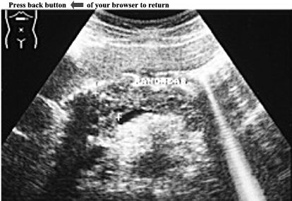 Transverse examination of epigastric region shows a normal sized pancreas with irregular contours. Pancreatic parenchyma is non-homogeneous. Small hyperechoic multiple foci with acoustic shadowing are visible mainly in the head of the pancreas. Anechoic structures, scattered all over pancreas correspond to ductal dilatation.